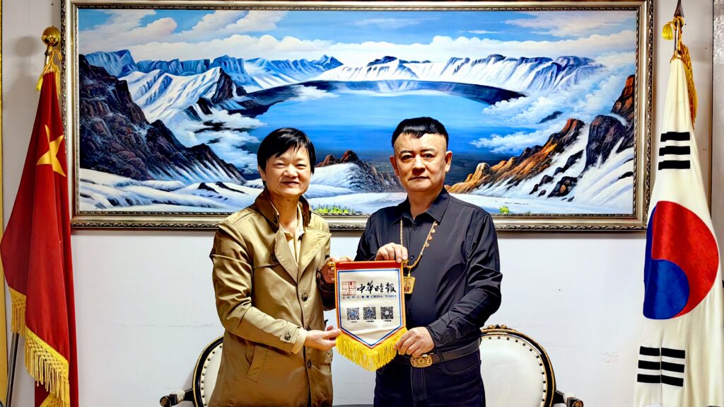 中华时报传媒集团主席曾晓辉(左)赠纪念旗给韩国新华快报社长曹明权先生(右)留念