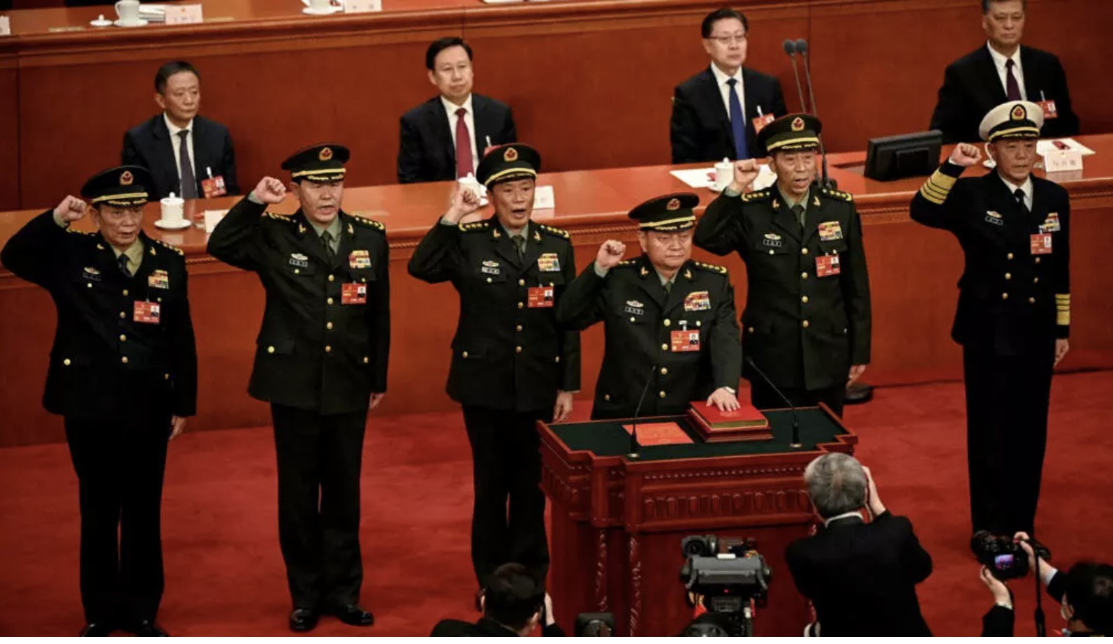 圖為2023年3月11日,在北京市人民大會堂舉行的全國人民代表大會第四次全體會議上,張又俠(前排)作為新當選的中華人民共和國中央軍事委員會副主席,與中央軍委委員(從左至右)張升民、 劉振立、何衛東、李尚福、苗華等委員共同宣誓。不過,到了2026年1月,圖片中宣誓的高級將領只剩下張升民,其餘全部落馬。