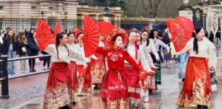 中國太極紅扇與馬面裙亮相倫敦蛇年春節遊行隊伍