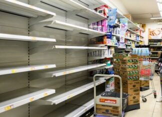 超级市场货架来不及补货。 新型冠状病毒肆虐之际,...