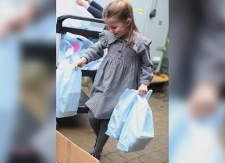 夏洛特拿起已袋好的盒裝食物,派送食物給受疫...