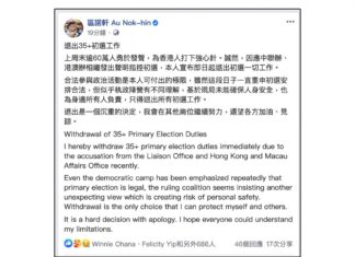 區諾軒稱因應兩辦聲明 退出初選一切工作