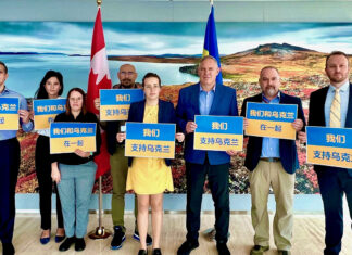 加拿大駐華使館週二(1日)掛在牆外聲援烏克...