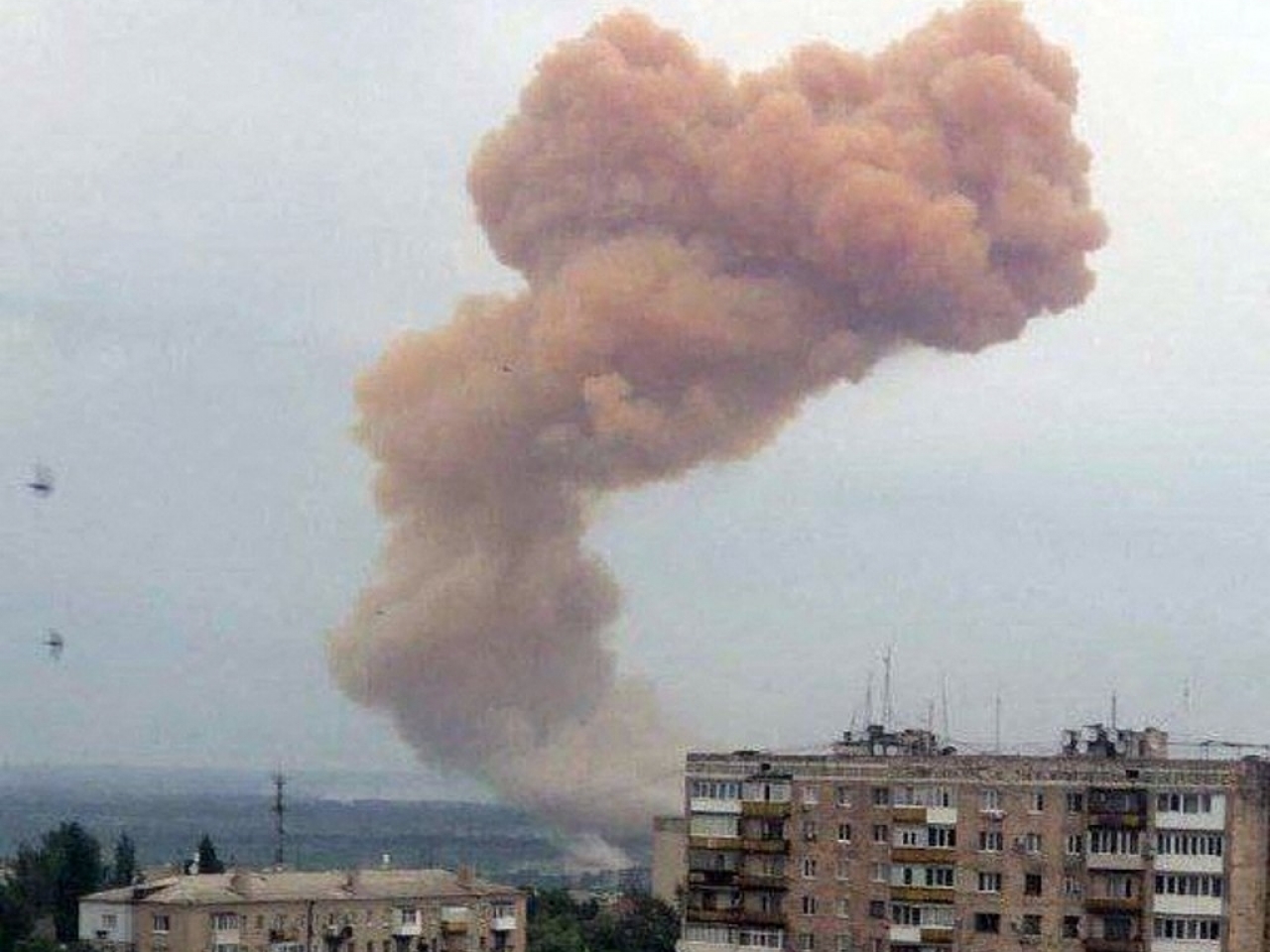 北頓涅茨克有化工廠被砲彈擊中冒煙。(法新社)