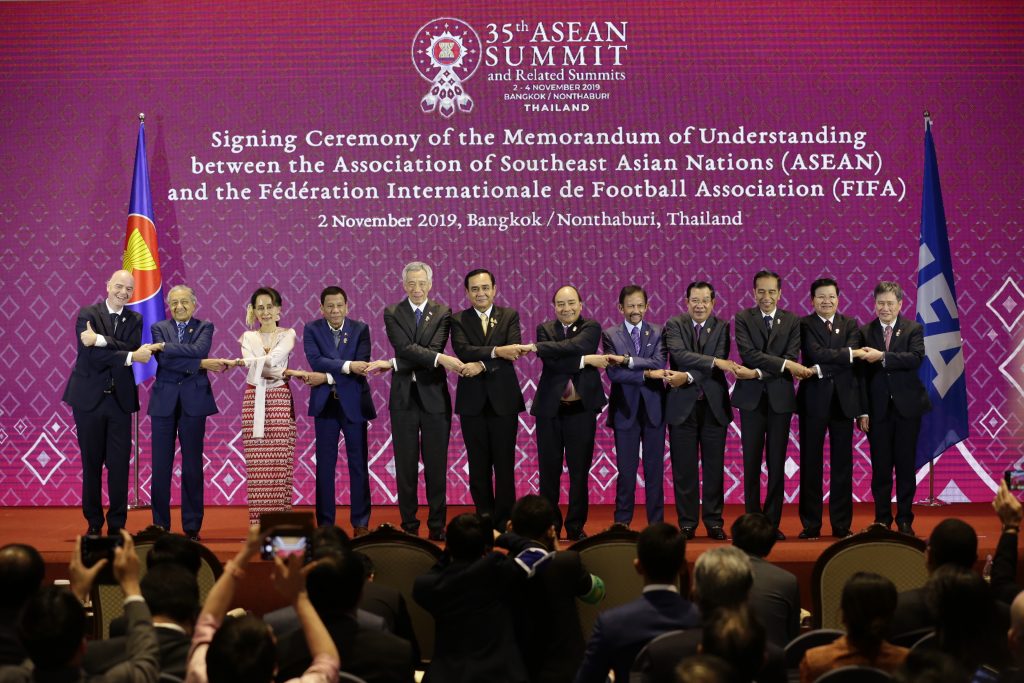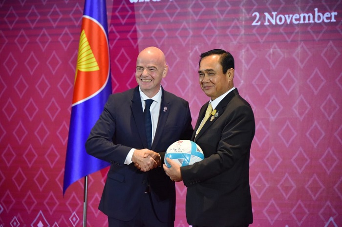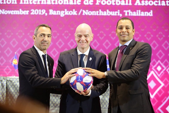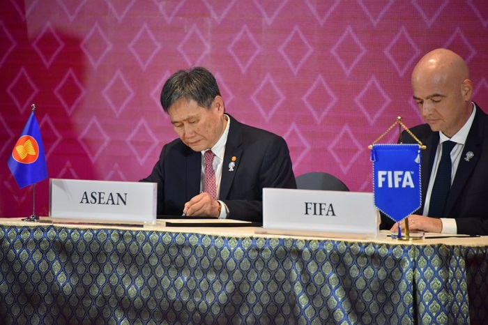 (中华时报讯)记者晓港曼谷报道:2019年11月2日,东盟秘书长林达海阁下和国际足联主席詹尼·英芬蒂诺先生与国际足联签署了谅解备忘录,以促进东盟国家联盟的发展以达到国际标准。谅解备忘录确定了东盟与国际足联今后在四个主要合作领域进行合作的任务。这些包括:体育诚信,体育促进发展,国际足联的学校足球计划和专业能力建设。