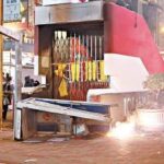 屡成示威者破坏目标的旺角站及太子站,昨傍晚开始聚集大批黑衣人,晚上约九时,他们分头行动,有人爬上旺角站出口破坏港铁标志,在外牆喷漆涂鸦,有人拆毁站内一个电话,现场一度冒出火光。晚上十时,在旺角站纵火的示威者试图破坏附近的华润堂,亦有人在亚皆老街一带设置路障及掘砖。