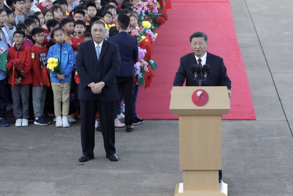 習近平於機場停機坪發表講話,指很高興能夠再次來到美麗的澳門,形容對澳門並不陌生,在二○○○年六月,就是澳門特區成立不到半年的時候,就曾來澳門訪問,之後也多次到澳門,最近一次是五年前,也就是澳門回歸祖國十五周年之時,他赴澳出席慶祝活動。
