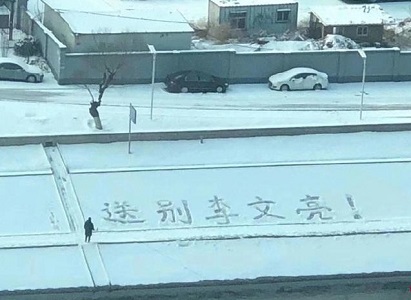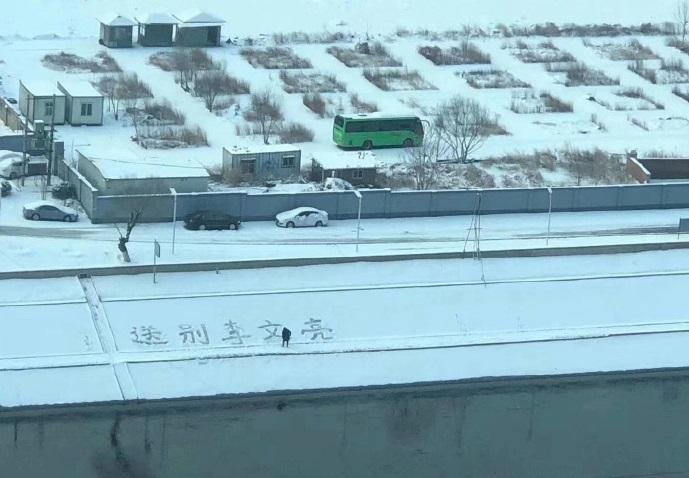 中国北京一位市民看着雪地里出现“送别李文亮”文字。(“威力无穷的威叔”微博)