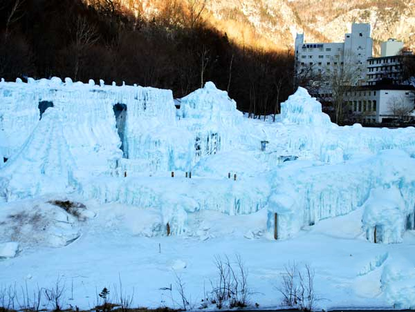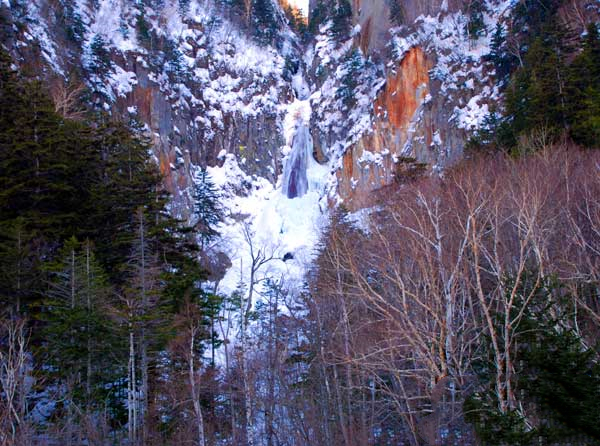 下了大巴车,映入人们眼帘的一片由冰雪世界构成的满目白色。地面上结着厚厚的冰凌与积雪,眺望山上的瀑布,其中一条已结冰断流,而另一条在坚实的冰层中硬是破涌而出,似一条细细的银河从天而降。这个在断崖之间大约90米高处汇成的溪流被称为流星瀑布,流星是雄,银河是雌,两个合起来称夫妻瀑布,是日本的一百瀑布名选之一。由于这里处于大山深处,阳光在下午四点多就被部分挡住了,所以导致气温极低,非常冷。好的是当晚下榻的又是一家温泉酒店,团友们当晚又美美地泡了这里的温泉以此驱寒。