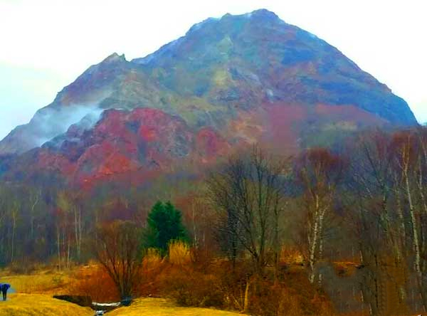 离开洞爷湖驱车来到位于大昭的昭和新山。这是北海道有珠郡壮瞥町的活火山,1943年12月开始到1945年9月期间,1944年6月,在发生地裂的同时,这一帯的麦田和松树林隆起,一夕之间就形成了昭和新山。半圆形的火山溶岩塔部分呈茶褐色,冉冉上升的水蒸气似白雾飞向天空。