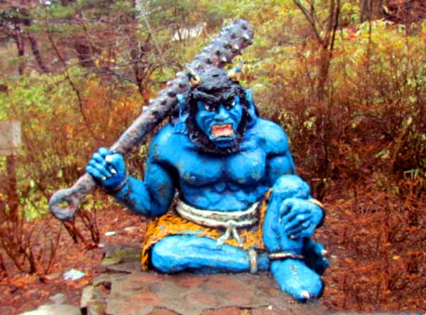 当天下午,来到最后一站–北海道的登别地狱谷。可惜抵达这里时,天上的雨虽然没有倾盆,但已如注;可既然到此,怎么也得望一眼这个好似地狱般的活火山。只见景区门口两座山神一蓝一红,一坐一立。相对于昭和新山的火山,前者是仰视,后者则俯瞰。然而升腾环绕的水蒸雾气生动地注解了活火山存在。