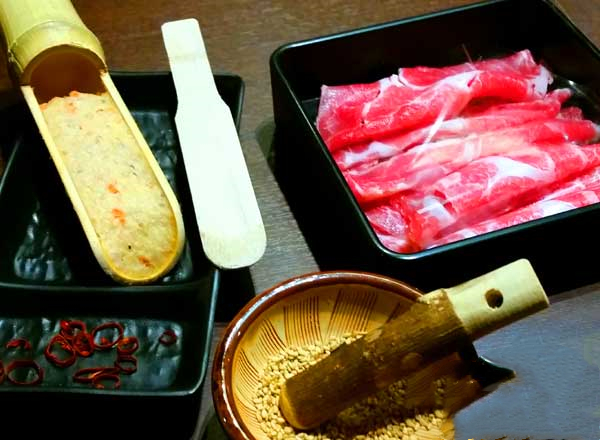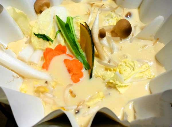 再有就是在位于札幌红灯区的一家名叫“樱家和洋创作”的餐馆,品尝的一道纯日本口味的套餐用“新、奇、特”三个字形容,基本上比较贴切。首先这家餐馆的称谓就有些品味,而当人们走进餐馆后顿时被满目的樱花所惊叹,虽说是假的,但也足以令人赏心悦目。接着,看着由似花瓣形状的火锅里乳白色沸腾的原汤是玉米汁,以及由芝麻盐、鲜猪肉片和用半圆形小竹板盛着的鱼滑及小菜、米饭等组成的套餐,精致小巧的让人不忍食用,当用欣赏艺术的眼光品味一番之后才动筷子品尝这套美食。