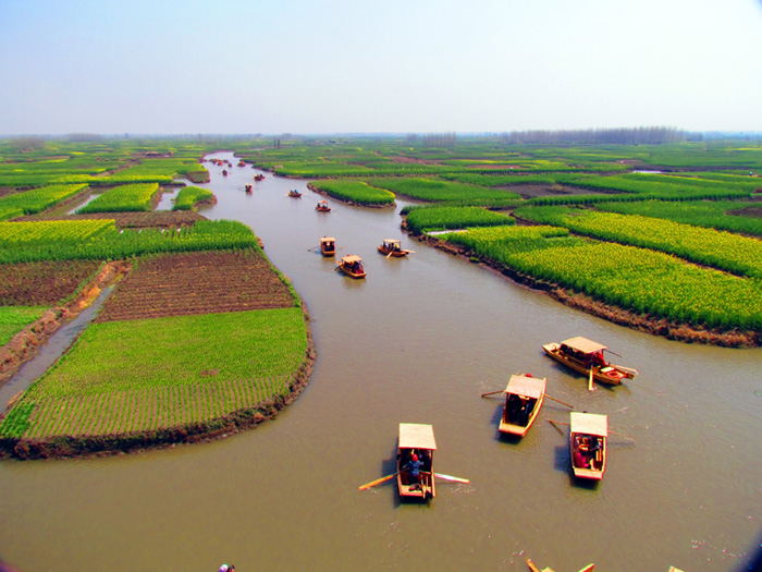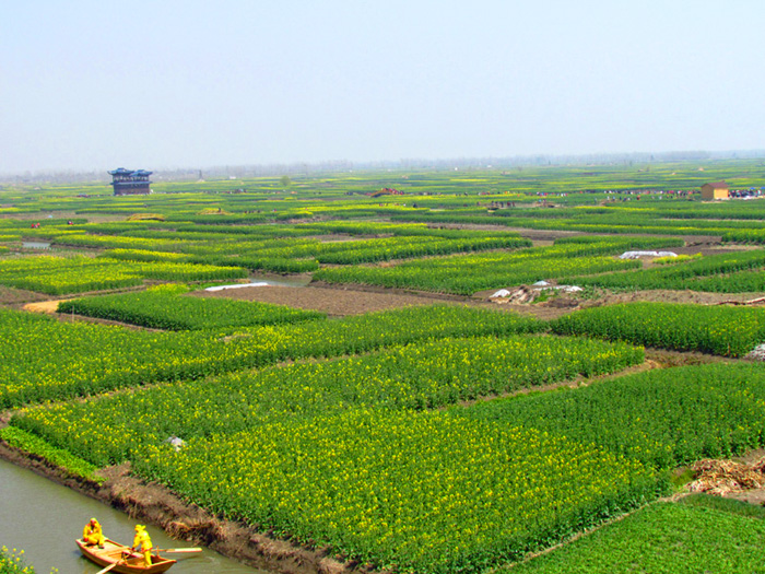 千岛菜花自然景观的千垛与沟河交错其中,垛格环水,景色怡人。远看油菜地,平畴无际;近观其详,每条垛田都浮漾于水中,活像是那硕大的水面盆景,曲折蜿行于垛地的沟恤纵横间。