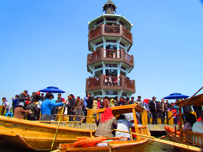 转眼间记者乘坐的小船来到瞭望塔下的码头前,由于这里登船与下船的交汇在一起,有些杂乱无序。致使游客们无论上或下都得费不少周折。下船后登上瞭望台俯瞰,千岛油菜花风景区尽收眼底,好一幅壮观的黄色花海美景。