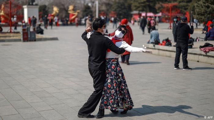 春意盎然 中国早就要求民众戴口罩。尽管疫情还没有过去,沈阳的这对舞伴还是忍不住翩翩起舞。他们在春天的阳光下沉浸在自己的世界里。