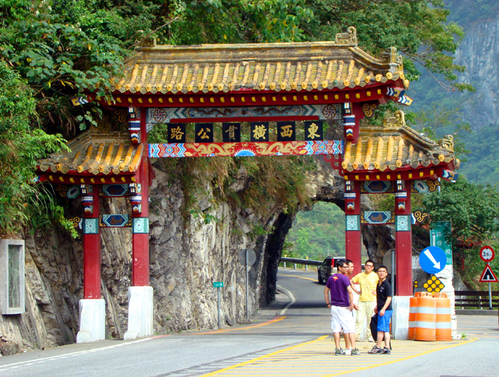 2009年5月17日上午8点半,游客们才从花莲市出发前往太鲁阁。首先到达的是“东西横贯公路”牌坊前,这里是东西横贯台湾公路的起点。穿过牌坊,往西就是著名的“东西横贯公路”,而随着“东西横贯公路”的宛转逶迤,将进入横跨花莲、南投以及台中三县,总面积达92,000公顷的台湾第二大自然生态公园–太鲁阁风景区。