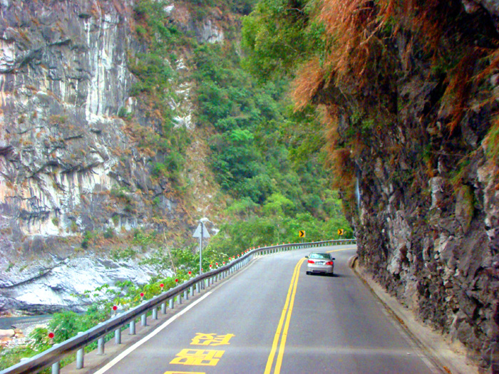 只要过了和平隧道,就可看见这悬在半空中的道路,层层的悬崖和峭壁相连着。一路上,全都是片麻岩和大理岩,壮阔的景观令人感到敬畏。走在这条公路上或许不会觉得害怕,但是当走完了这条路,回头望时,才体会到这一路上的险境。而旅游团的大巴车正是顺着这条险峻的沿海公路一直驶到了苏澳港,最后于当晚抵达宜兰礁溪。