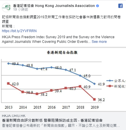 以100分为满分,调查结果得出公众人士对2019年香港新闻自由评分为41.9,延续了自2016年稍有回升后的跌势;新闻工作者评分为36.2,比2018年指数显著下滑,打破了自2015年起的升势。