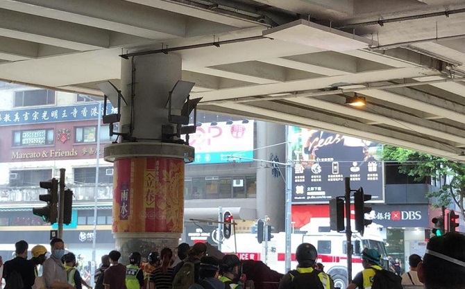 大批防暴警員在鵝頸橋施放多枚催淚彈後,在軒尼詩道戒備,突然被投擲物件。有警員要由同袍以盾牌協助離開,之後有警員向堅拿道西方向發射胡椒球彈。