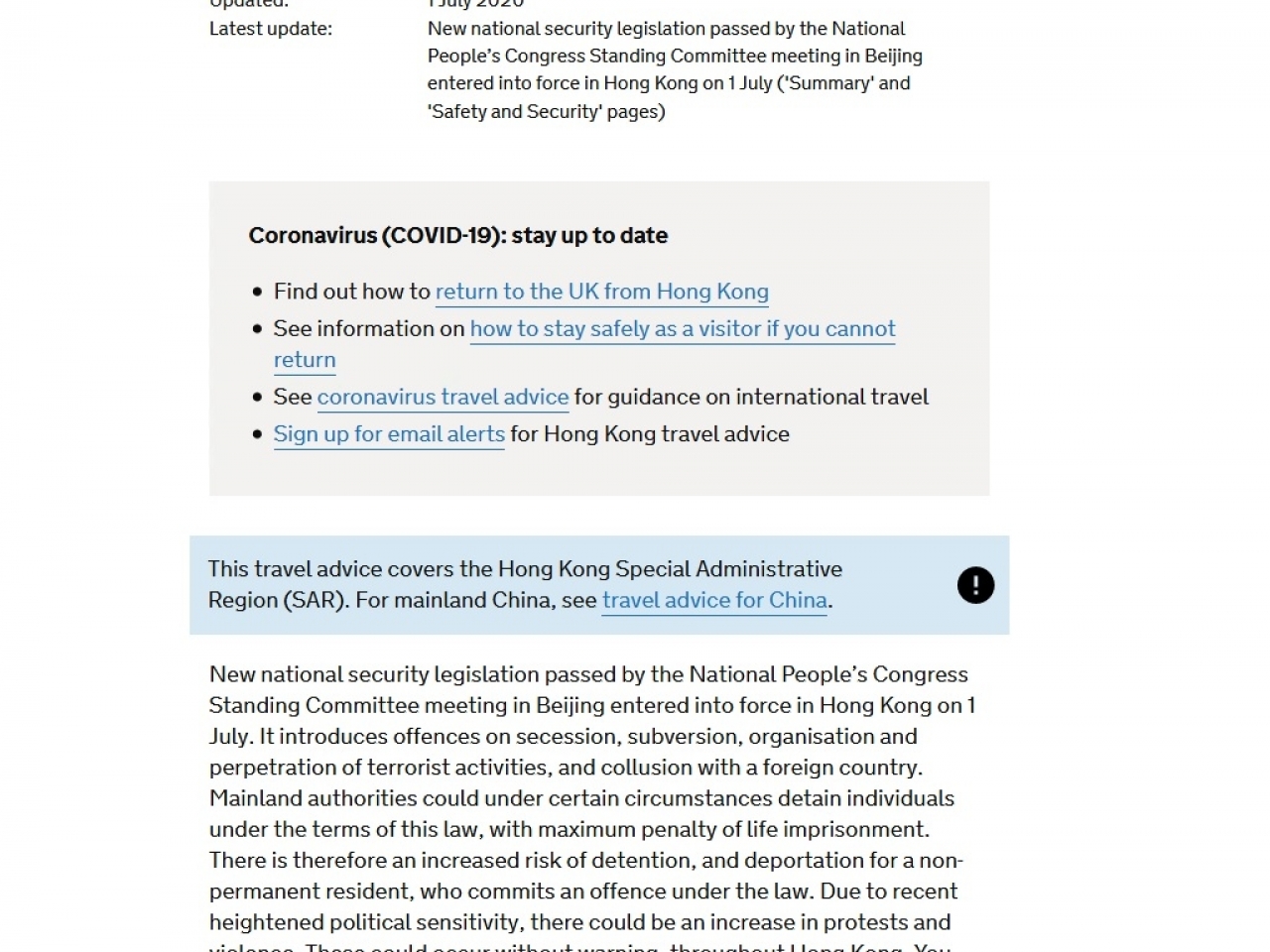 专题国际港澳港版國安法香港 英國及加拿大更新往香港的旅遊建議 稱被拘留風險上升 由 中華時報總編室 - 编发 2020年7月2日 英國和加拿大更新對前往香港的旅遊建議,表示因應「港區國安法」實施,在香港被拘留的風險有所增加。 其中,英國外交部表示,北京當局可能在某些情況下,根據「港區國安法」條款,拘捕部分人士,最高刑罰是終身監禁,違反法律的非香港永久居民被拘留和驅逐出境的風險上升。 英國外交部的建議又提到,由於最近政治敏感度提高,在香港的抗議和暴力活動有可能增加,國民應該避免參與其中。