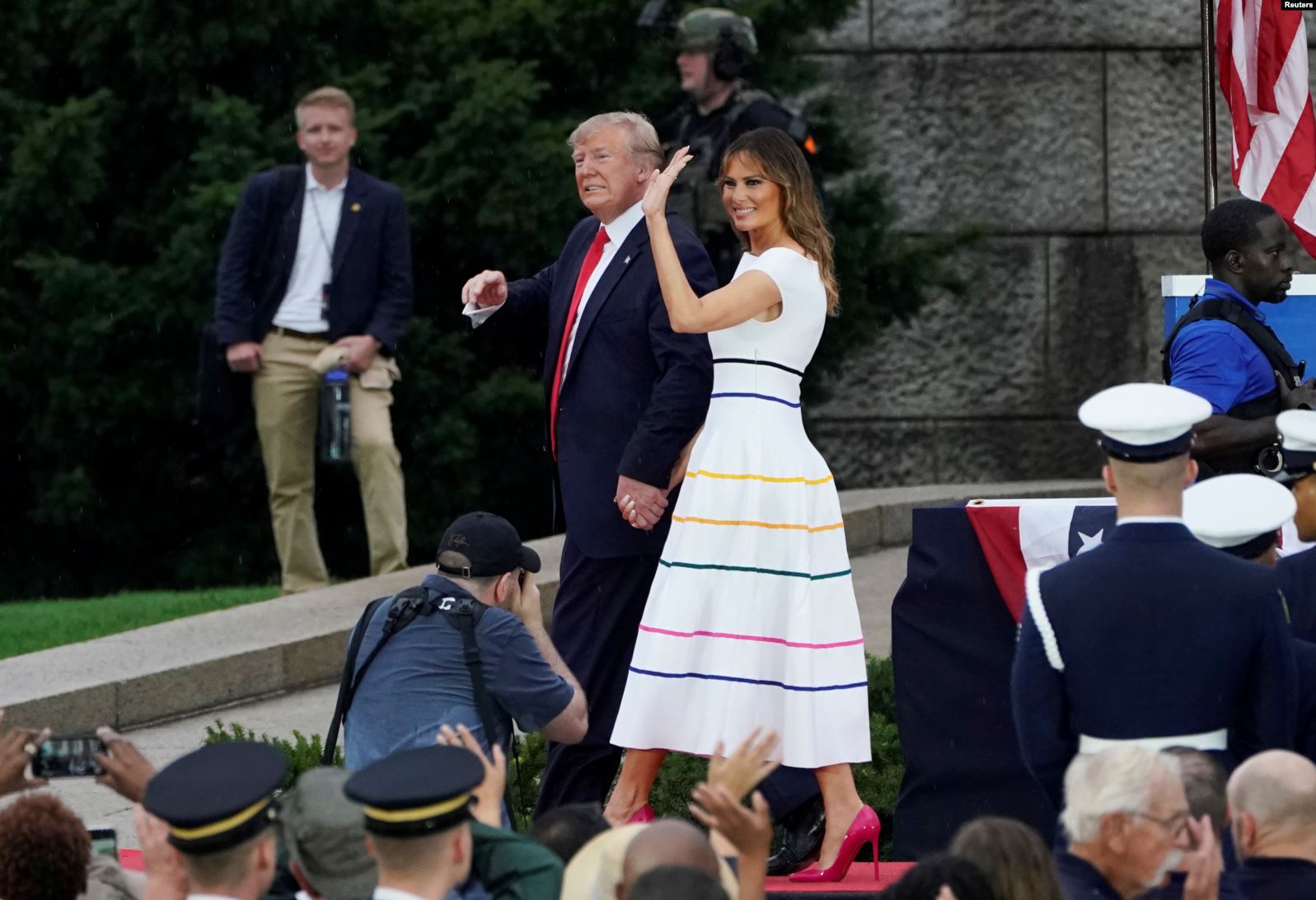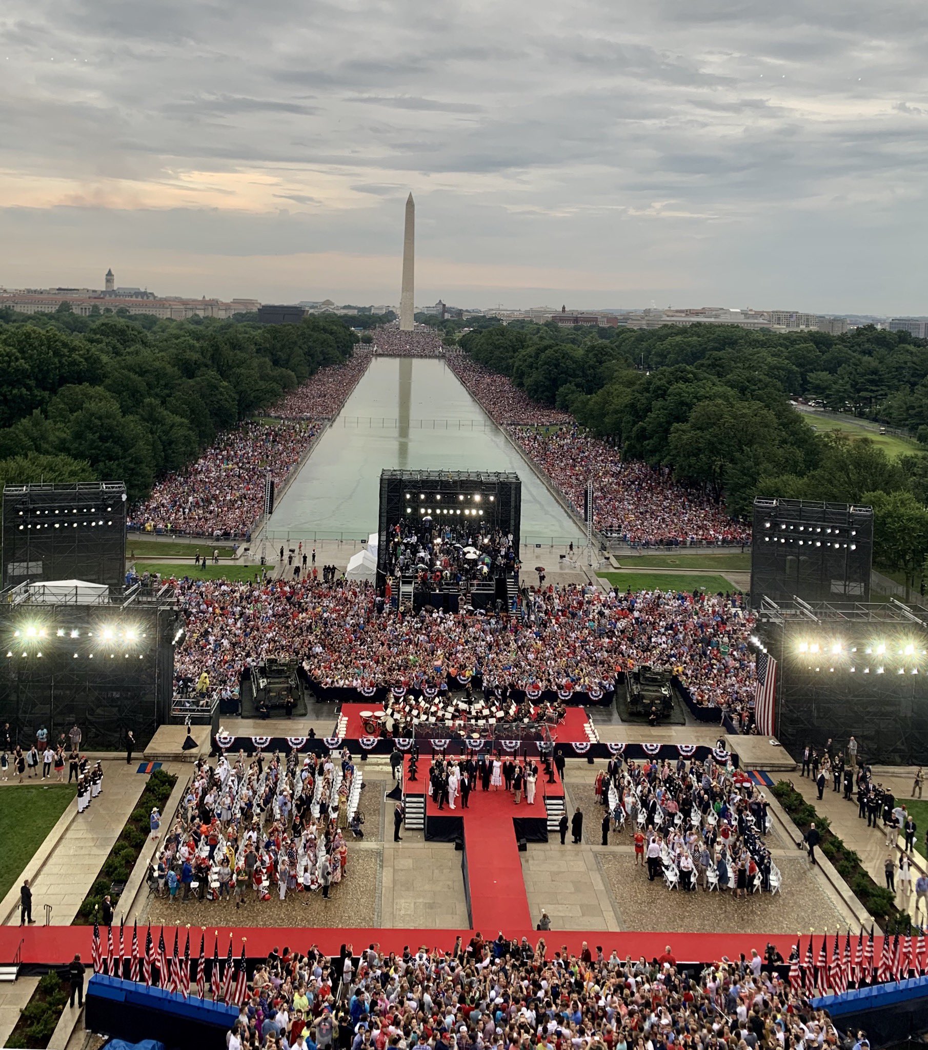 特朗普总统讲话前在推特上说:“来自远方各地的人今天和今晚和我们聚集在一起,参加将是我国历史上最大的庆典之一。‘向美国致敬’,在林肯纪念堂一整天的活动,高潮是全世界最现代和最先进的飞机大规模低空飞行。”