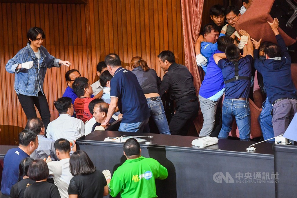 為求明天能順利行使同意權投票,民進黨團今天下午15時47分進場,與國民黨立委爆發嚴重推擠;部分國民黨立委遭民進黨立委抬走後,群起繞到側門,再從議場後門猛撞,讓民進黨立委反而遭到包圍。