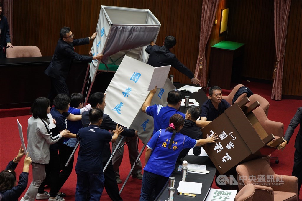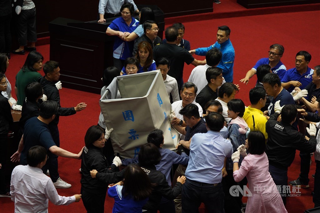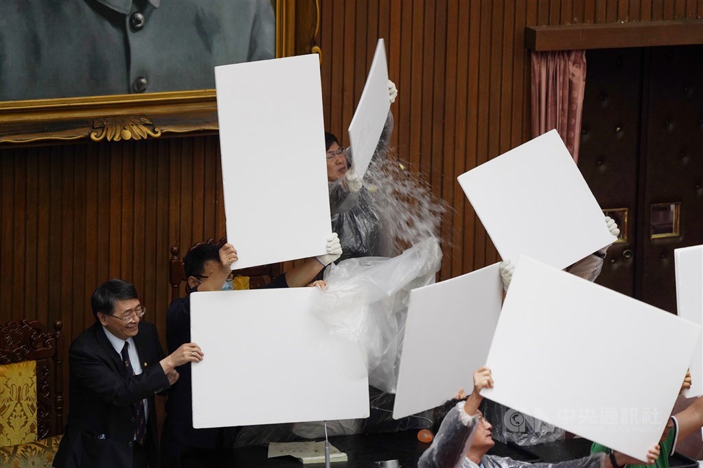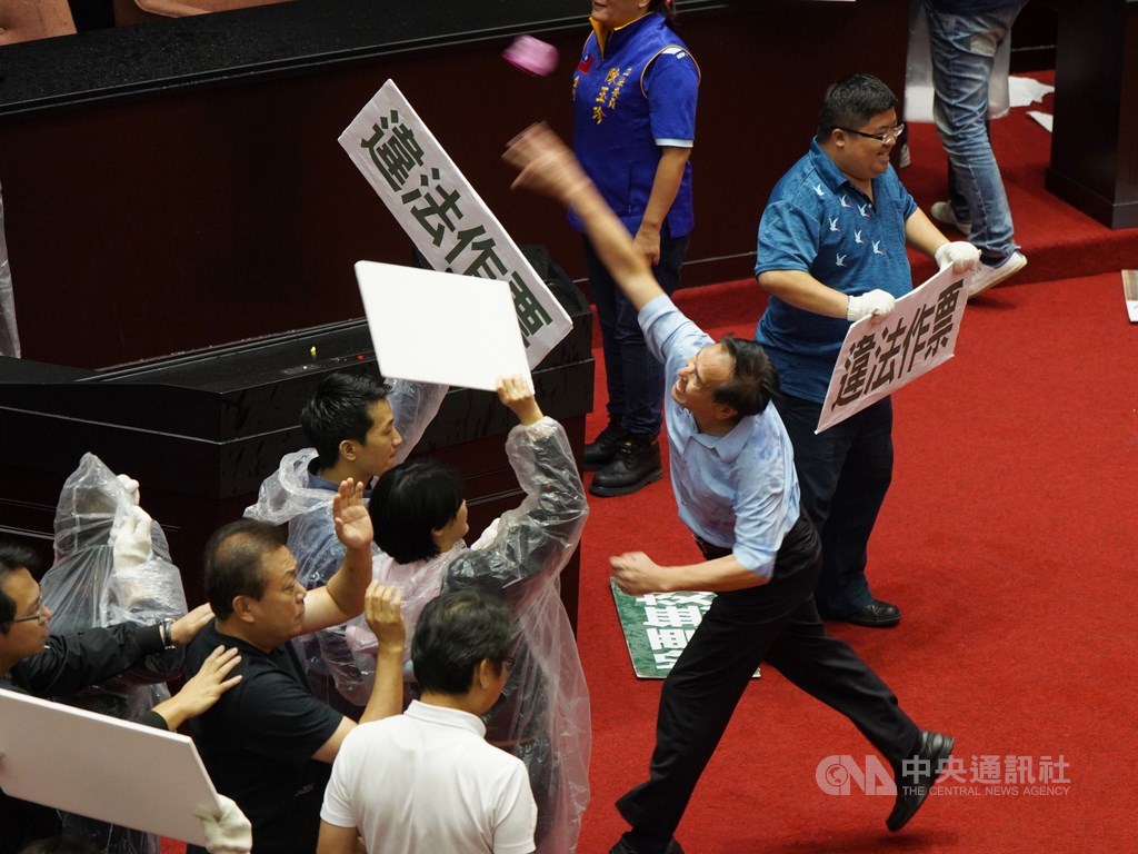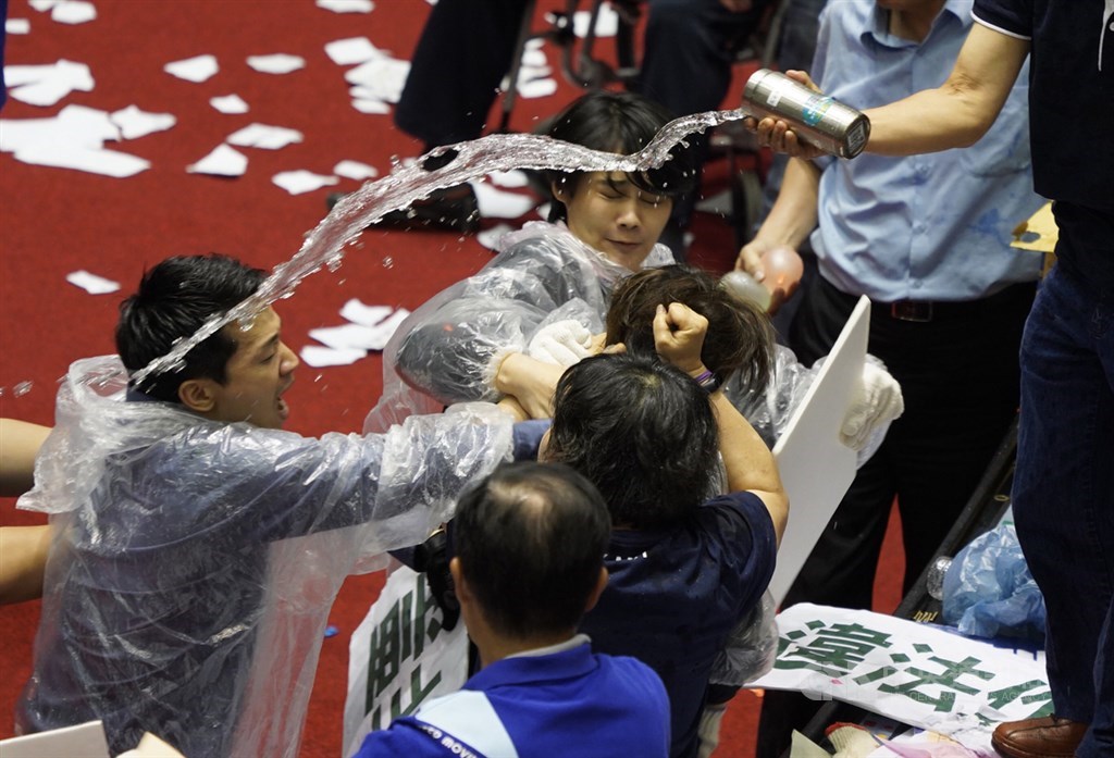 立法院會17日進行監察院人事同意權案投票,國民黨立委丟水球、灑水企圖阻擋開票,並與民進黨立委爆發肢體衝突。中央社記者徐肇昌攝 109年7月17日