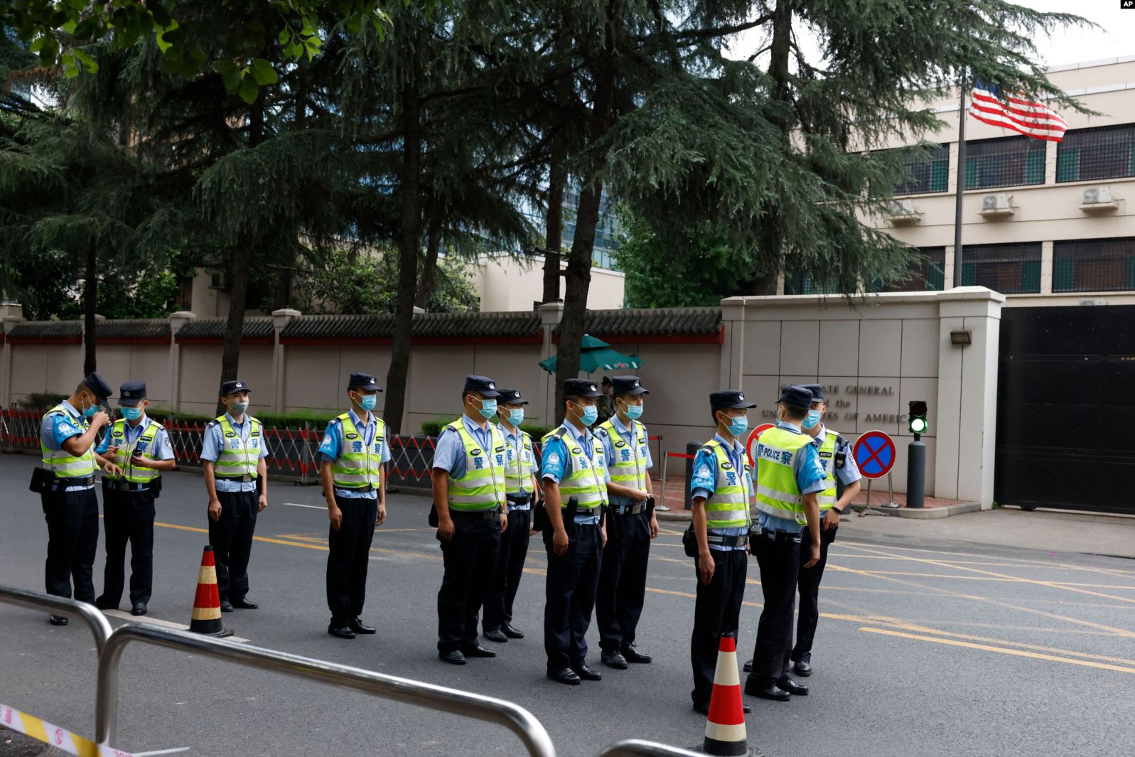 (资料照)美国驻成都总领馆门口的执勤武警喝令拍照记者离开。