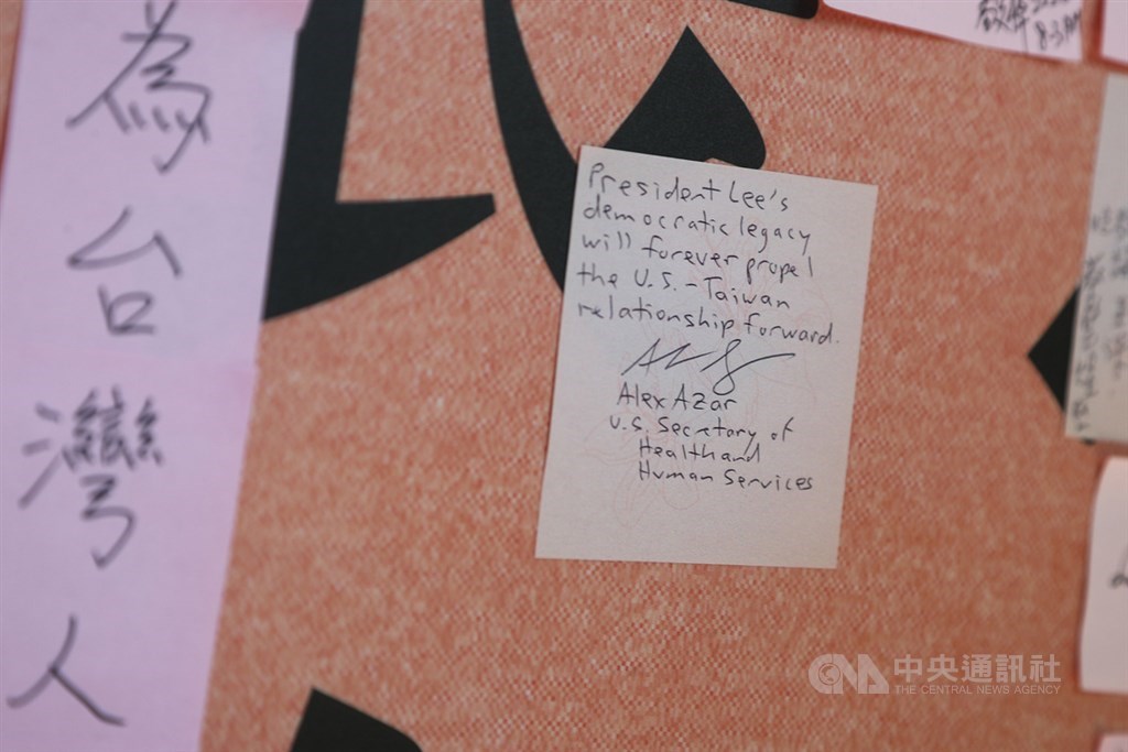 (中華時報/中華新聞通訊社台北12日電)美國衛生部長阿紮爾今天到台北賓館追思前總統李登輝,他在追思紙條留言:「李總統遺留的民主資產,將永遠推動美台關係向前進。」
