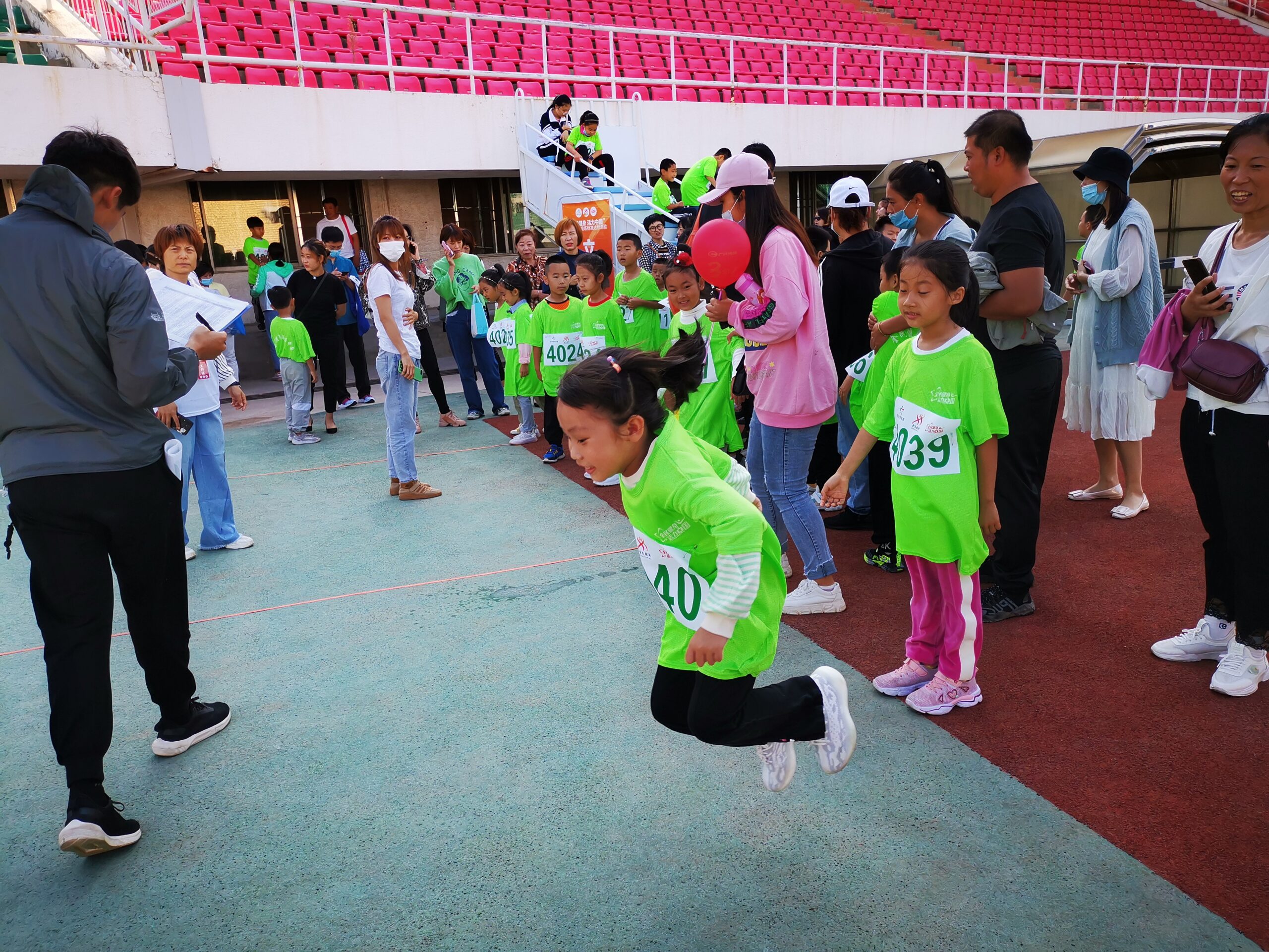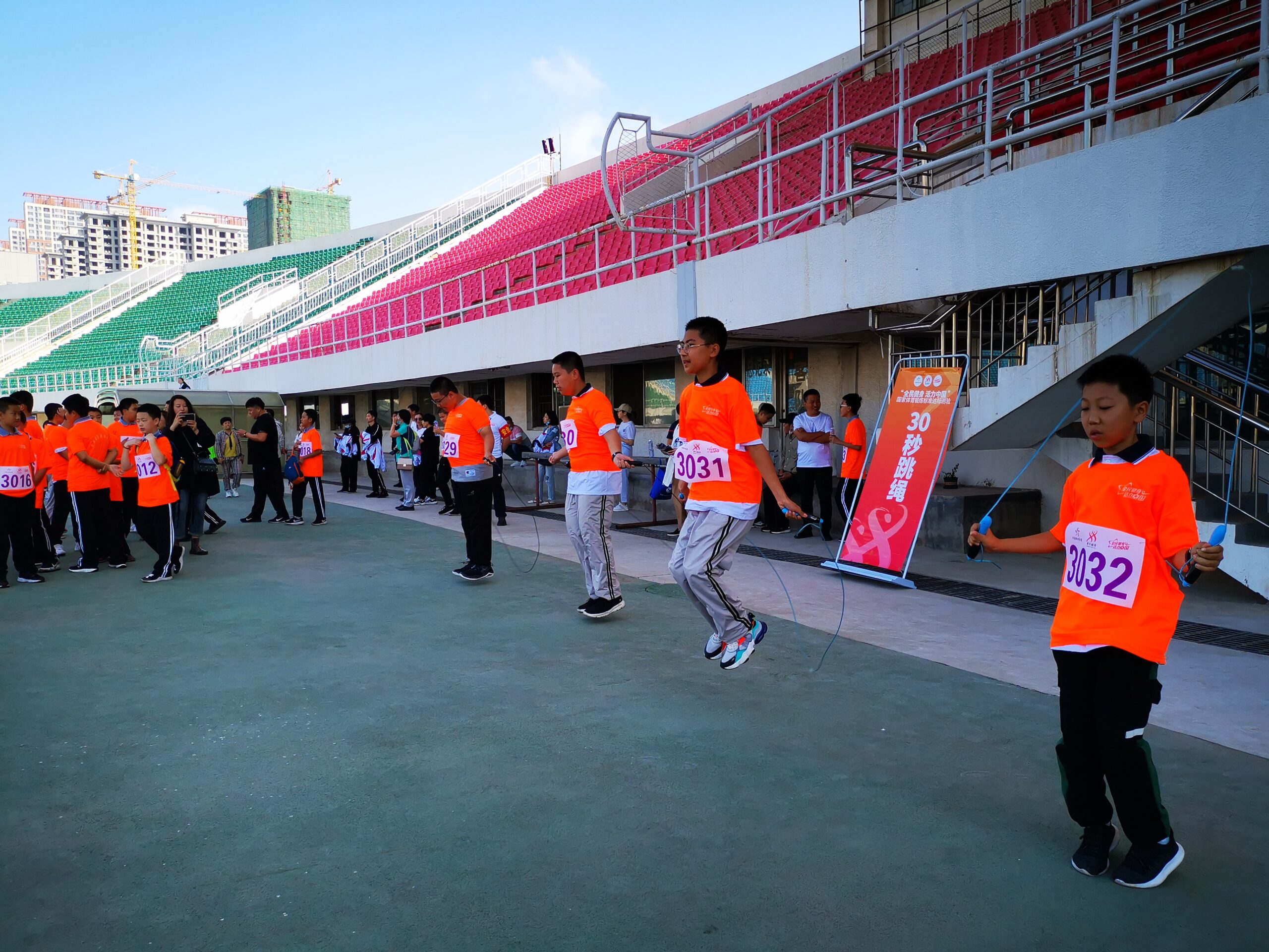 参赛运动员按照年龄分为儿童、少年、青年三个组别,每个组别分男、女两类,按照《国家体育锻炼标准》,根据不同组别进行了30秒跳绳、1000米跑、800米跑、立定跳远、绕杆跑、坐位体前屈等五类体能测试。