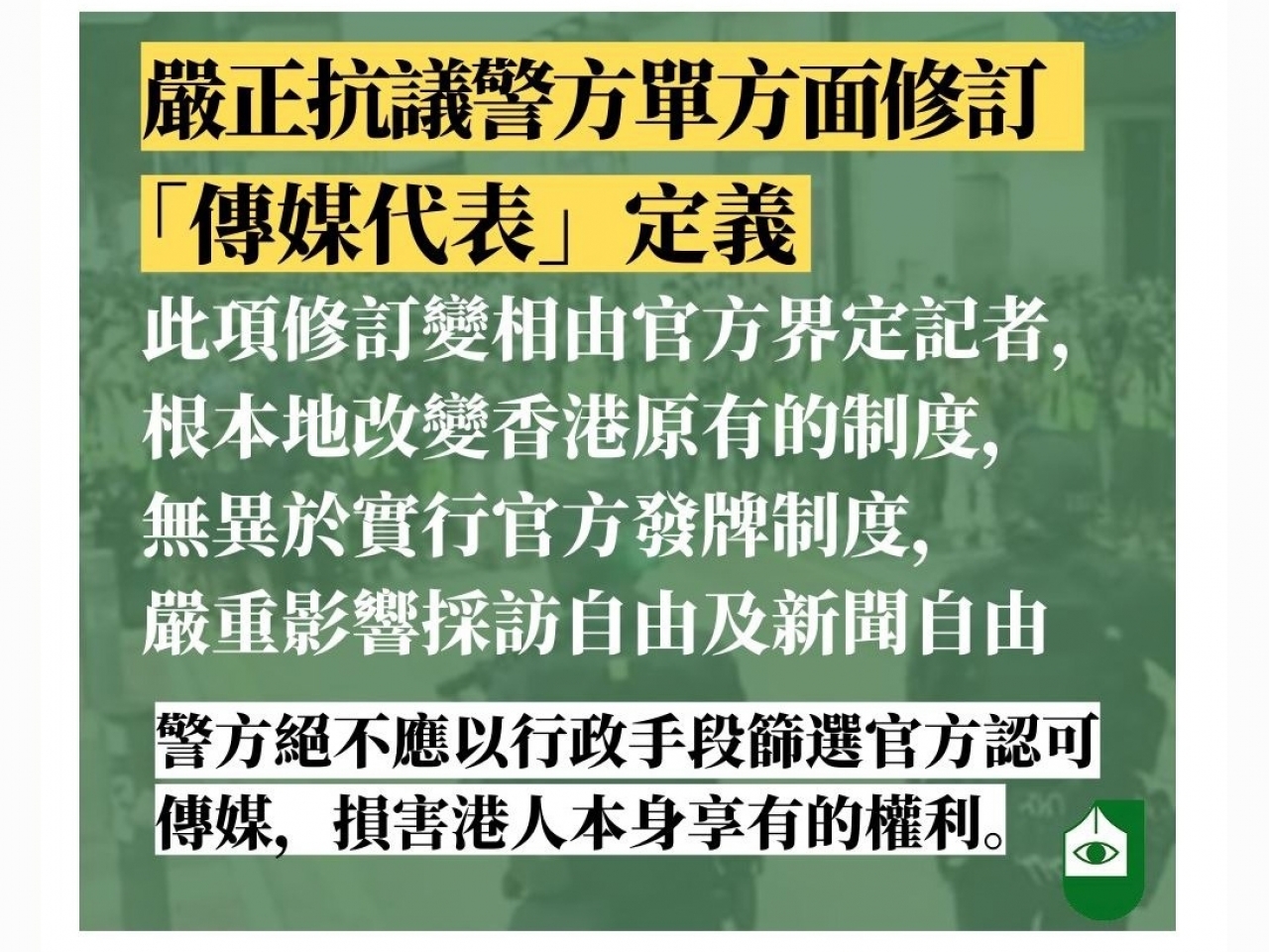 香港八傳媒組織聲明:警方草率修訂傳媒定義無異於官方發牌