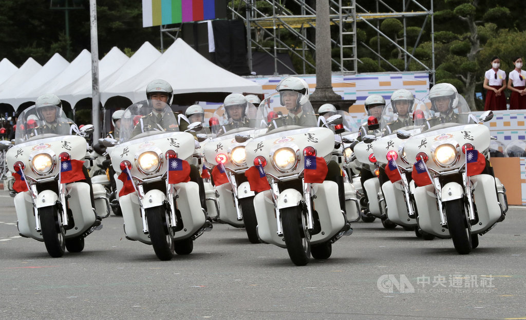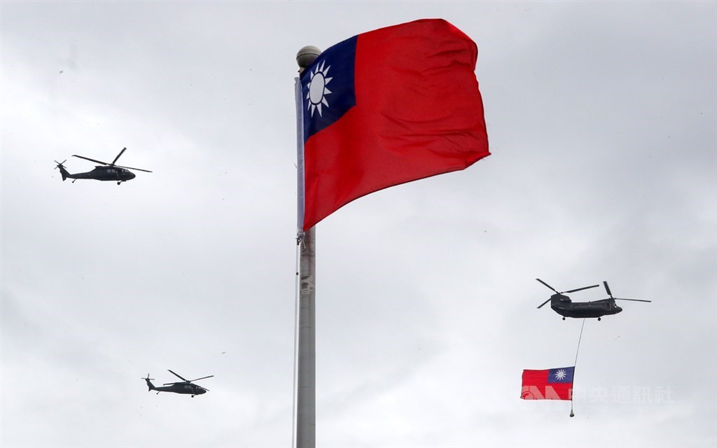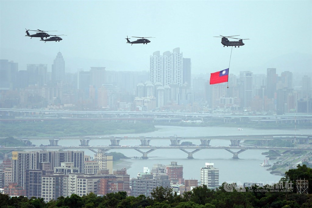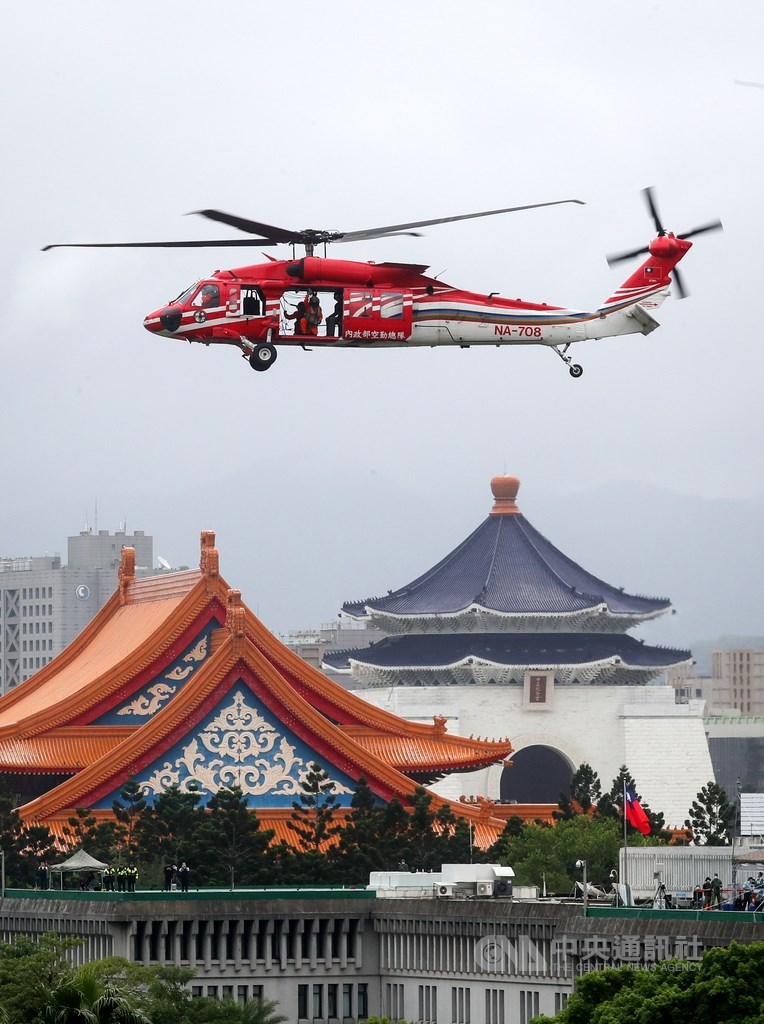 國慶典禮今天舉行,序幕暖場階段,由三軍樂儀隊、憲兵快反連、維安特勤隊及空勤總隊黑鷹演出及演練,俗稱「紅鷹」的空勤UH-60M黑鷹直升機,首次以低高度飛進總統府限航區。