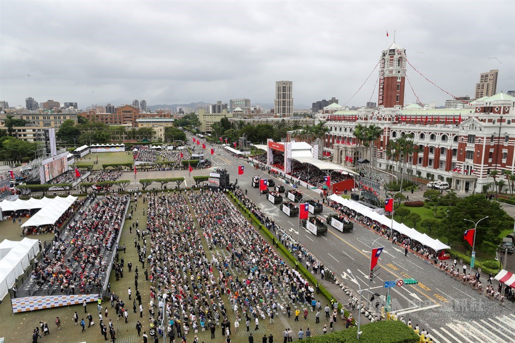此外,最受矚目的空中展演項目,除陸航CH-47SD運輸直升機吊掛國旗,搭配UH-60M黑鷹直升機編隊,也有雷虎小組為天空畫上藍白紅彩煙,更加入了近年完成升級的F-16V戰機,首次在府前上空編隊衝場。