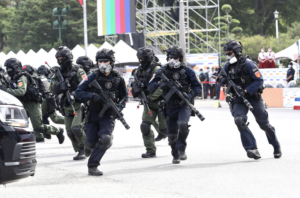 緊接登場的,則是北一女中樂儀旗隊帶來「婆娑之洋,美麗之島」演出,隨後則由警政署與空勤總隊帶來「捍衛治安,守護台灣」的反劫持演練,這項演出於凱達格蘭大道、重慶南路T字路口進行車輛追逐、甩尾動作,相當震撼。