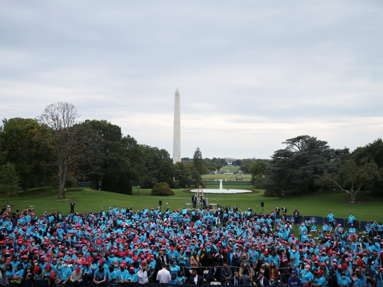 特朗普总统星期六(10月10日)在白宫阳台上向在南草坪参加“为了法律与秩序而和平抗议”活动的数百名支持者发表了18分钟的讲话。这是他星期一出院后首次公开露面。他走出阳台时戴着口罩,并在讲话时摘掉了口罩,引发支持着热情的回应。几百人获邀在南草坪出席。大多数人有戴口罩,但没有怎样保持社交距离。