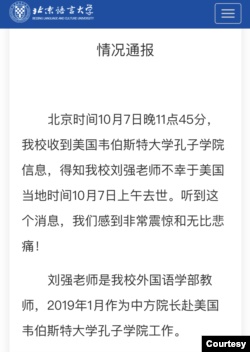 北京语言大学星期天(10月11日)发表了“情况通报”,证实刘强是该校外国语学部教师,2019年1月作为中方院长赴美国韦伯斯特大学孔子学院工作。