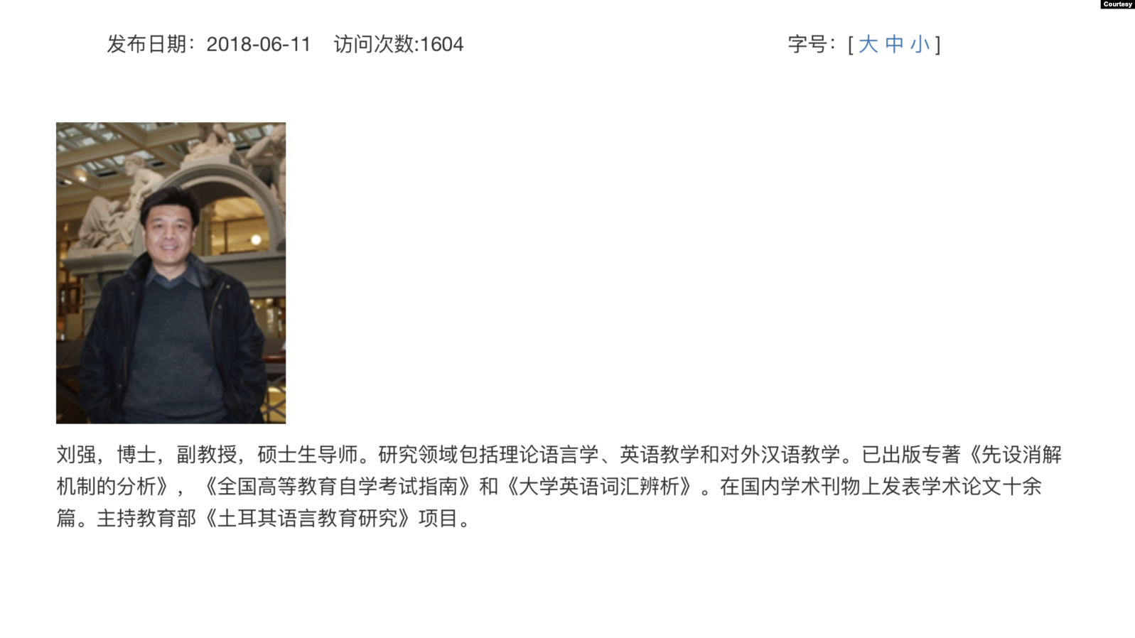 北京语言大学网页上附又照片的介绍称,有博士头衔的刘强为副教授、硕士生导师,“研究领域包括理论语言学、英语教学和对外汉语教学”,出版过数本专著,发表过十余篇论文。