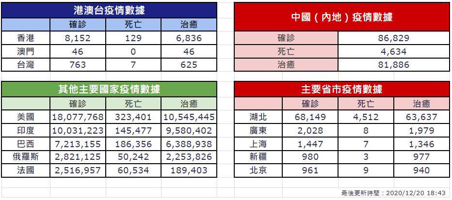 (中華時報/華聞社12月20日綜合報導)美國約翰霍普金斯大學統計,全球的新型肺炎確診個案超過7600萬宗,累計168萬人死亡。