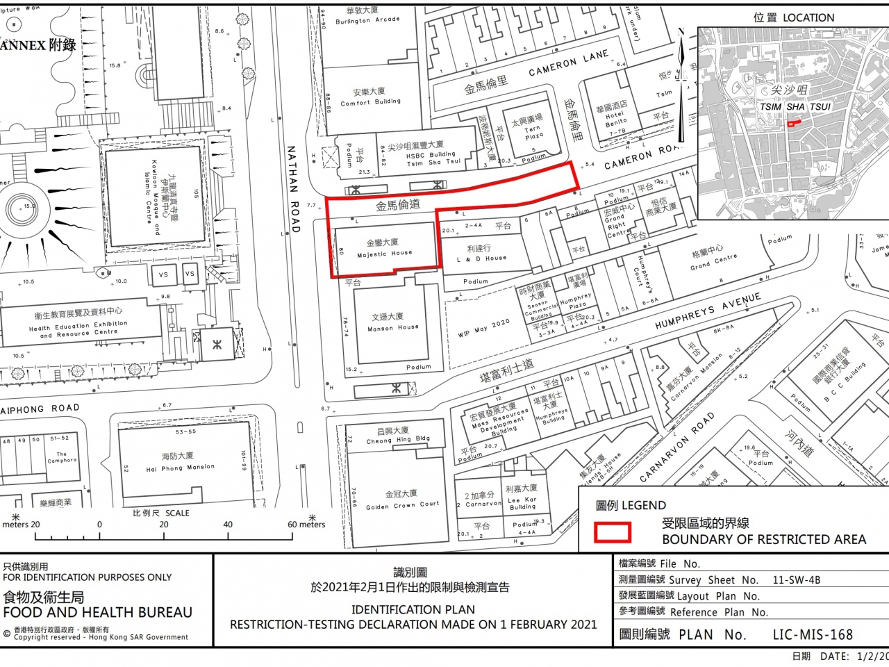 另一個地點是尖沙咀彌敦道80號金鑾大廈,居民同樣要留在單位等檢測,如果已經檢測並有陰性證明,就毋須重新檢測。