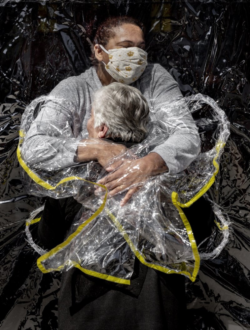 尼森的作品「第一個擁抱」於2020年5月在巴西聖保羅的一家養老院拍攝,圖中的主角是一名85歲的老婦人魯納迪(Rosa Luzia Lunardi)與護理師蘇薩(Adriana Silva da Costa Souza),她們在疫情肆虐下,透過養老院自己發明的「擁抱帷幕」相擁。這是85歲的魯納迪在5個月中的第一個擁抱。