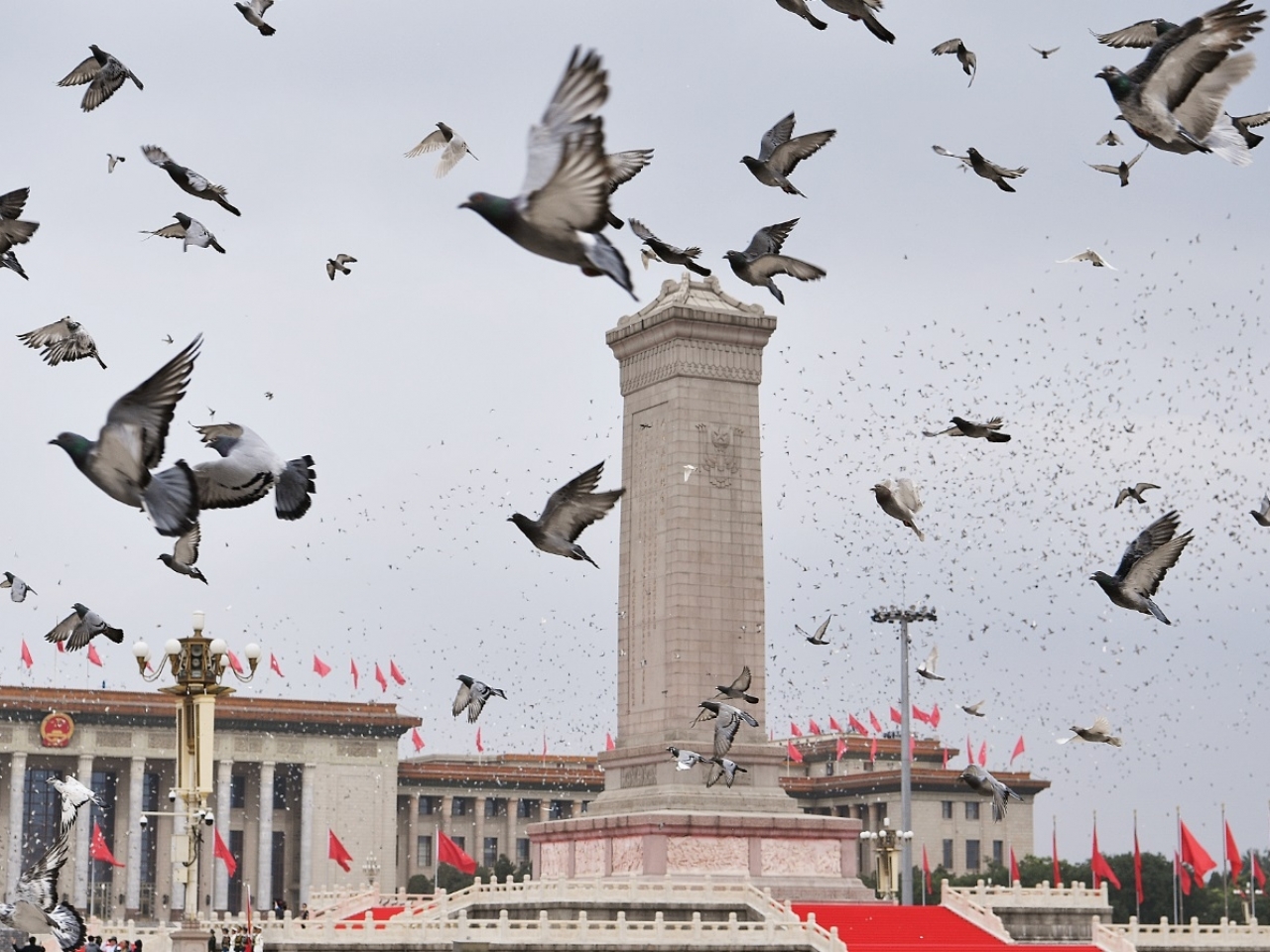 中共總書記習近平、總理李克強與其他中央政治局常委、前國家領導人胡錦濤、溫家寶等人步上天安門城樓,「直-10」直升機隊飛越天安門上空,掛上中共黨旗及慶祝標語,排列出「100」隊形,「殲-10」機隊則排列出「71」隊形,15架隱形戰鬥機「殲-20」公開亮相,機隊排列成「人」字隊形。