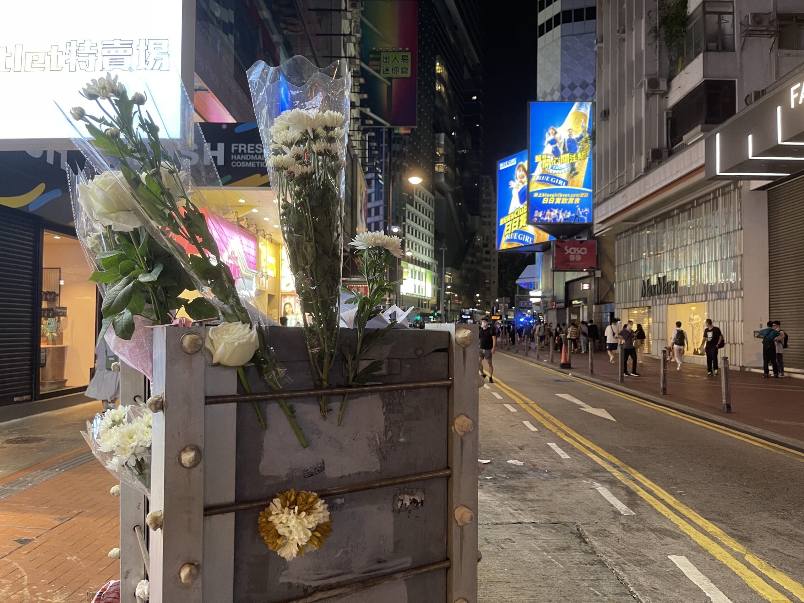 有人情緒激動,有市民手持白花到場,打算獻花悼念,被警員拒絕,部分人被記下個人資料,有人在崇光百貨對面行人路的欄桿放下白花。