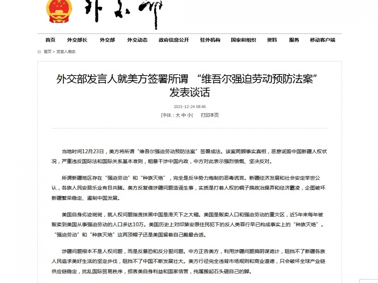 發言人指,所謂新疆地區存在「強迫勞動」和「種族滅絕」,完全是反華勢力炮製的惡毒謊言;重申涉疆問題是反暴恐和反分裂問題。中方正告美方,美方行徑完全違背市場規則和商業道德,只會破壞全球產業鏈供應鏈穩定,擾亂國際貿易秩序,損害美國自身利益和國家信譽。