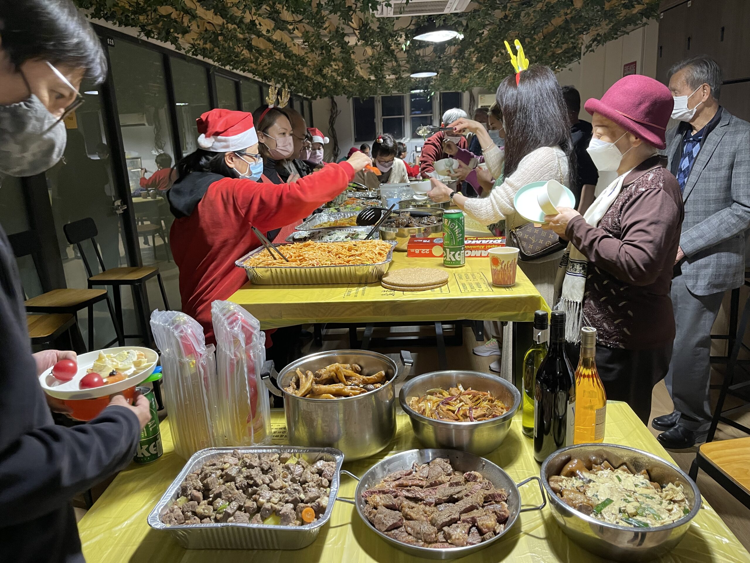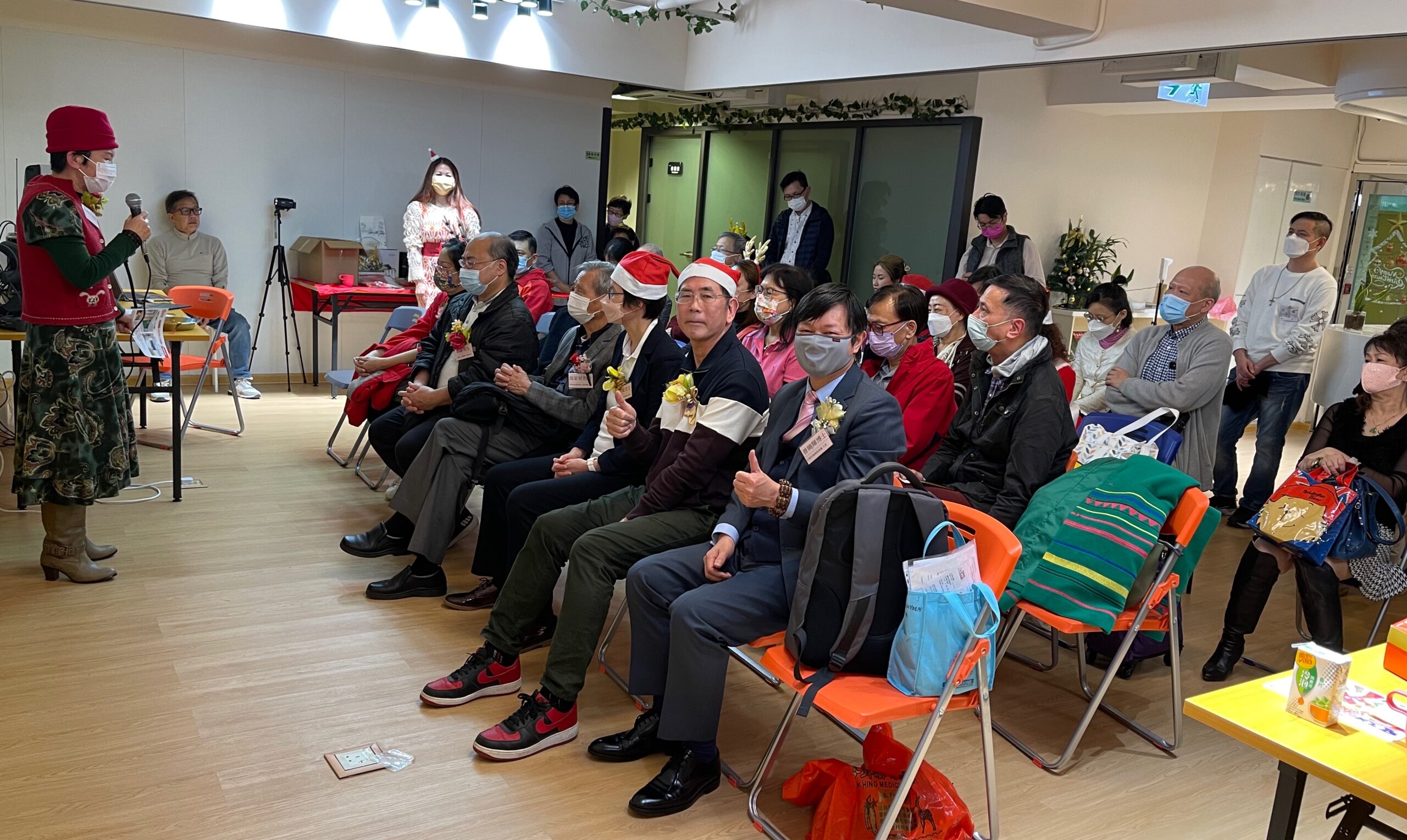 今天是圣诞节,参加者大多穿戴具有聖誕氣氛的衣飾 ,也按照传统习俗自備一份價值HK$50以內的小禮物作互相交換用及抽奖。