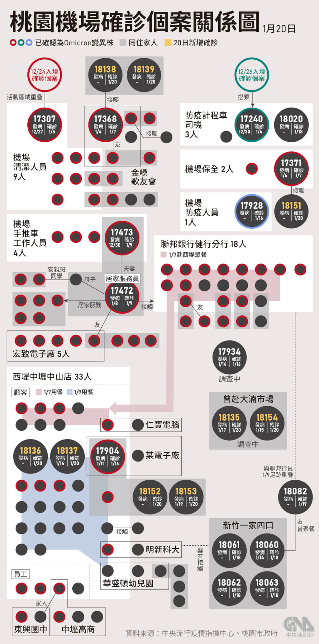 中央流行疫情指揮中心20日公布,新增5名感染源待釐清病例,分別為高雄一家三口確診,及2名桃園個案與大湳市場有地緣關係,國內至今累計4條待釐清傳播鏈。