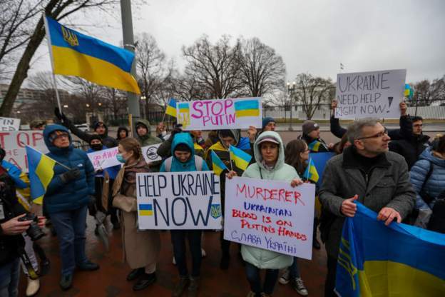 Image caption: 白宮外有示威者聲援烏克蘭。 - 俄羅斯入侵烏克蘭已經整整一天,夜幕降臨後,首都基輔開始實行宵禁。
