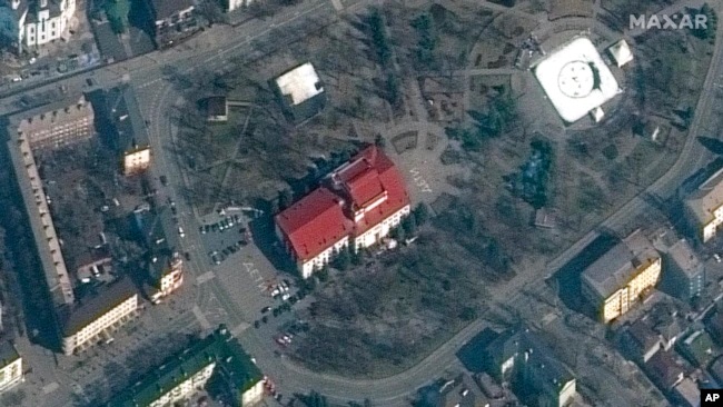 Maxar Technologies衛星圖像公司說,3月14日的圖像顯示,劇院建築前後都寫有白色的俄語大字“兒童”。