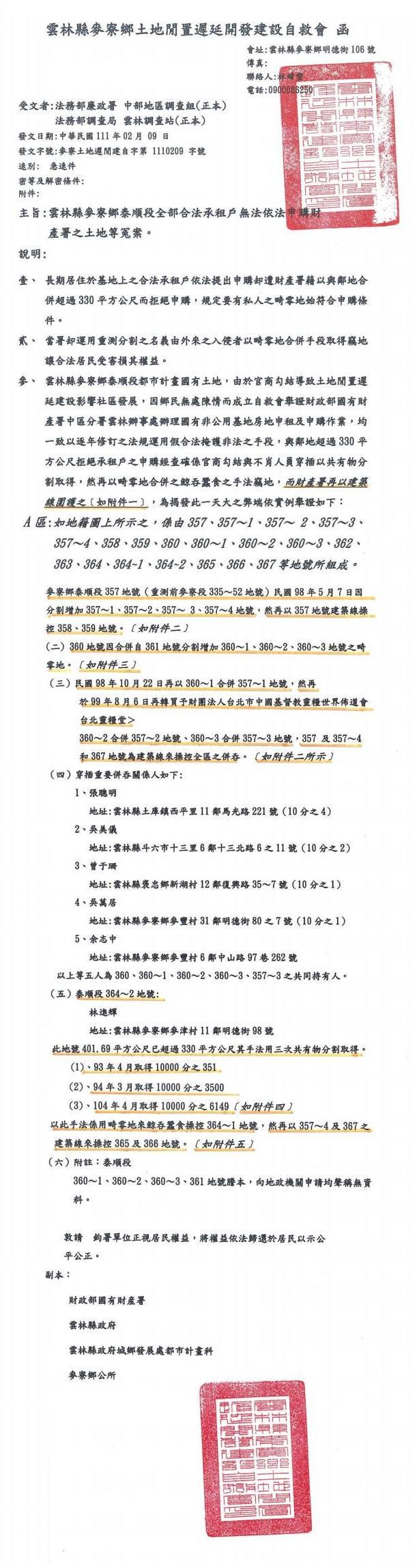 【記者王輝丹/雲林報導】據雲林縣麥寮鄉閒置土地遲延開發建設自救會廿二日表示:期待法務部廉政署、法務部調查局、財政部國有財產署、雲林縣政府、雲林縣政府城鄉發展處都市計畫科、麥寮鄉公所等各政府單位,祈以能依事實凝聚群力體恤民情來共同關心鄉民居住正義權益問題,盼能儘速處置麥寮土地遲閒建字第1110209字號之案情,以促使雲林縣麥寮鄉泰順段等全部合法承租戶能依法申購國有財產署土地正義權利之問題。