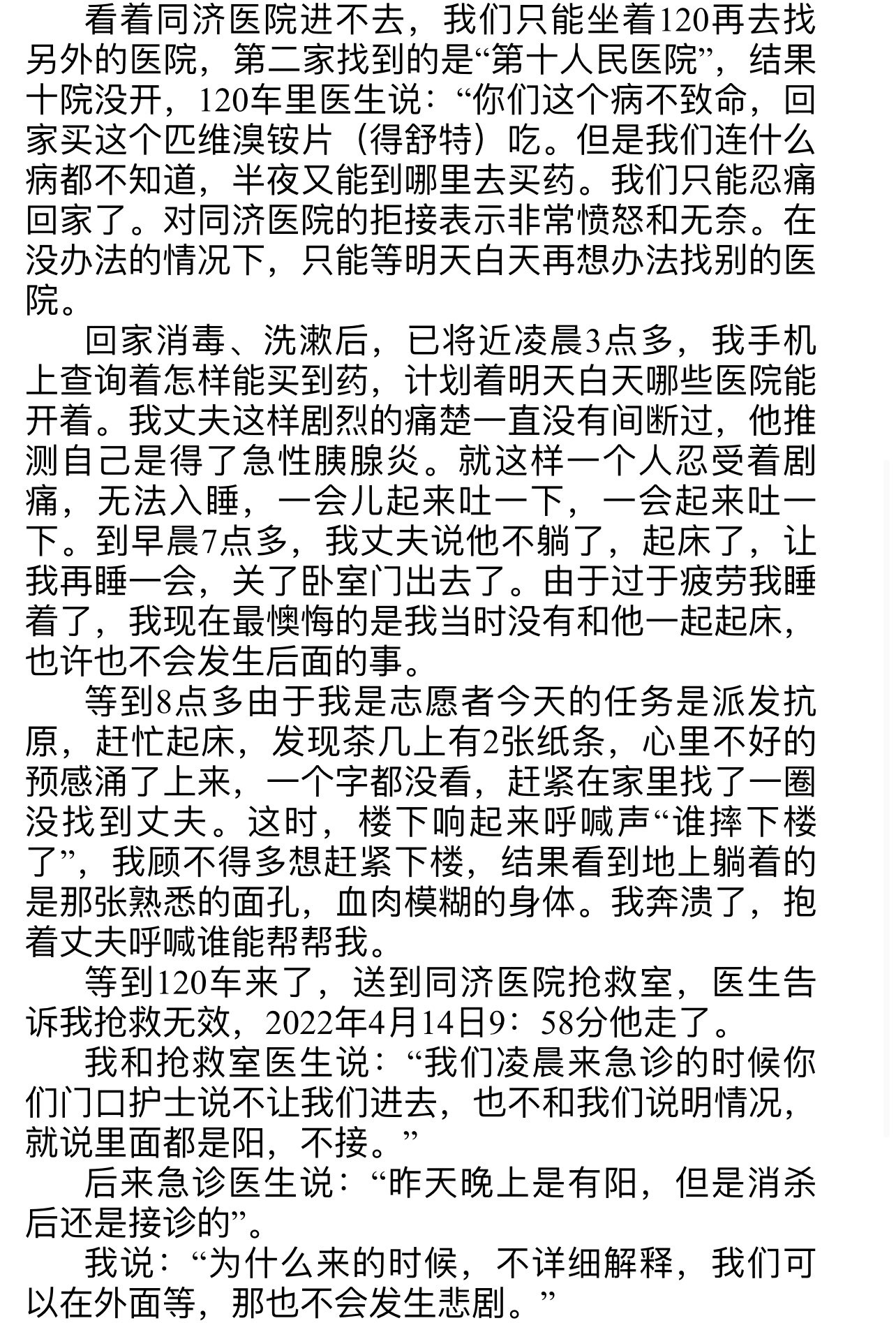 丈夫死後,同濟醫院的急診醫生說,「昨天晚上是有陽,但是消殺後還是接診的。」