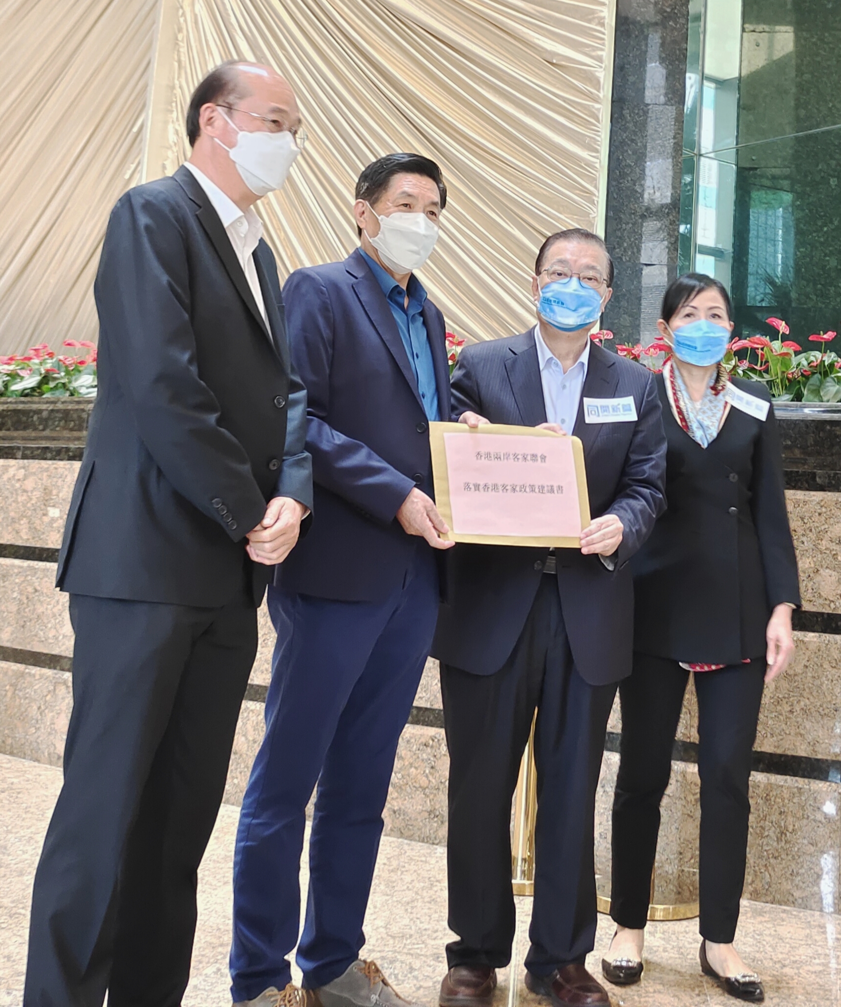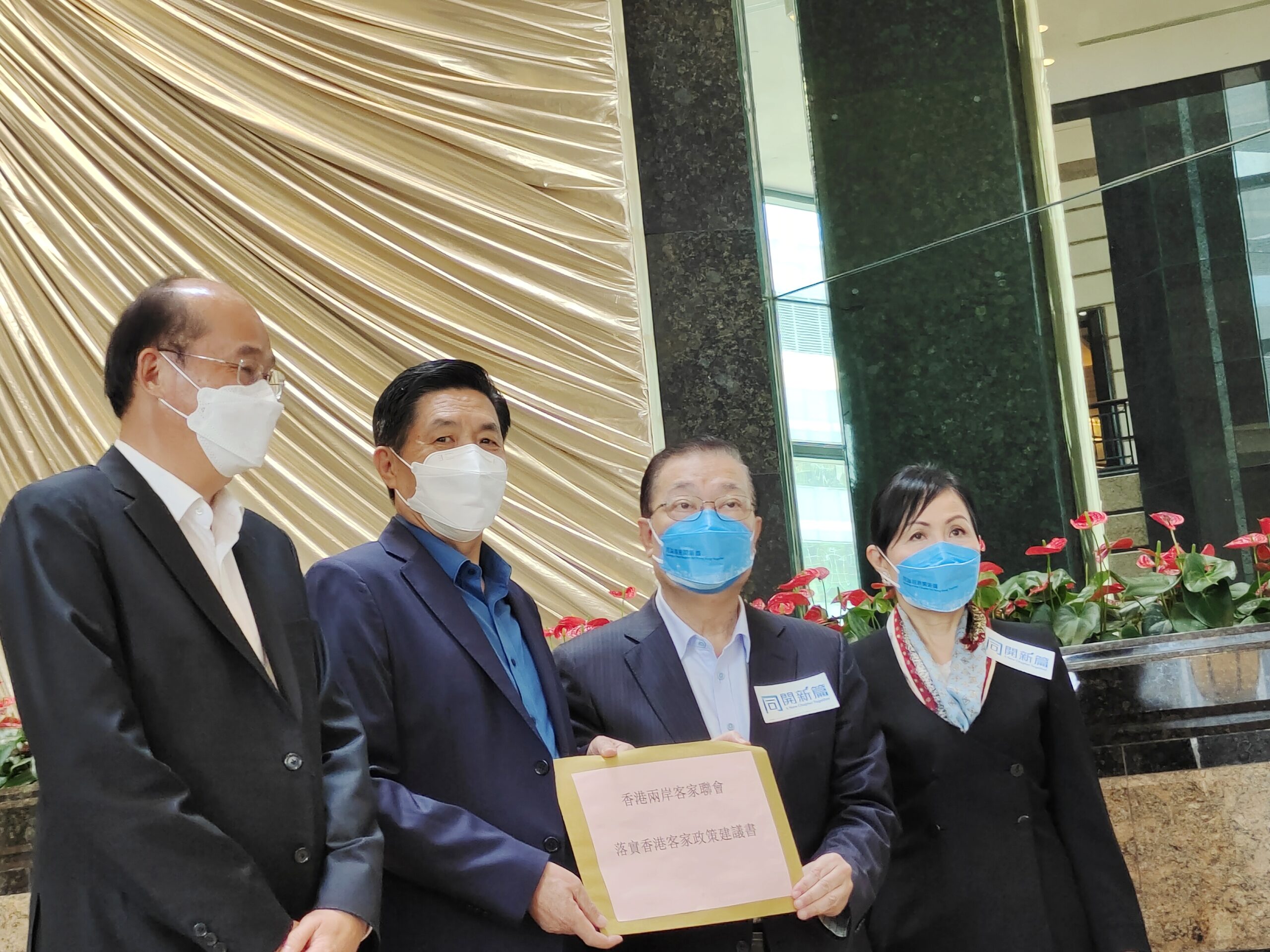 (中華新聞通訊社/中華時報香港4月26日訊)4月27日,香港兩岸客家聯會向第六屆行政長官候選人李家超辦公室遞交《落實香港客家政策建議書》,由香港兩岸客家聯會會長江全孚,兩岸客家研究院院長李劍諸,香港兩岸客家聯會常務理事兼副秘書長廖潤昌、蘇建輝、劉秀娟,副秘書長葉淑平提交,特首候選人李家超競選辦公室主任、全國人大常委譚耀宗代表接收。